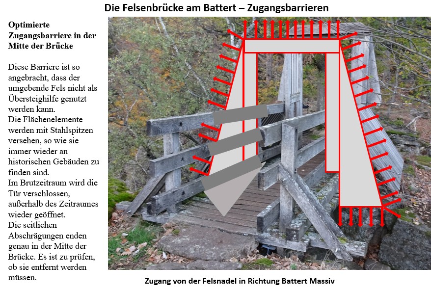 Auch der kostengünstige Vorschlag des Alpenvereins, die Kletterhaken zu verschrauben, um die Benutzung zu verhindern, wurde vom Regierungspräsidium abgelehnt. Das Regierungspräsidium hat die Kletterhaken mit einem großen Kostenaufwand durch Abflexen vernichtet.