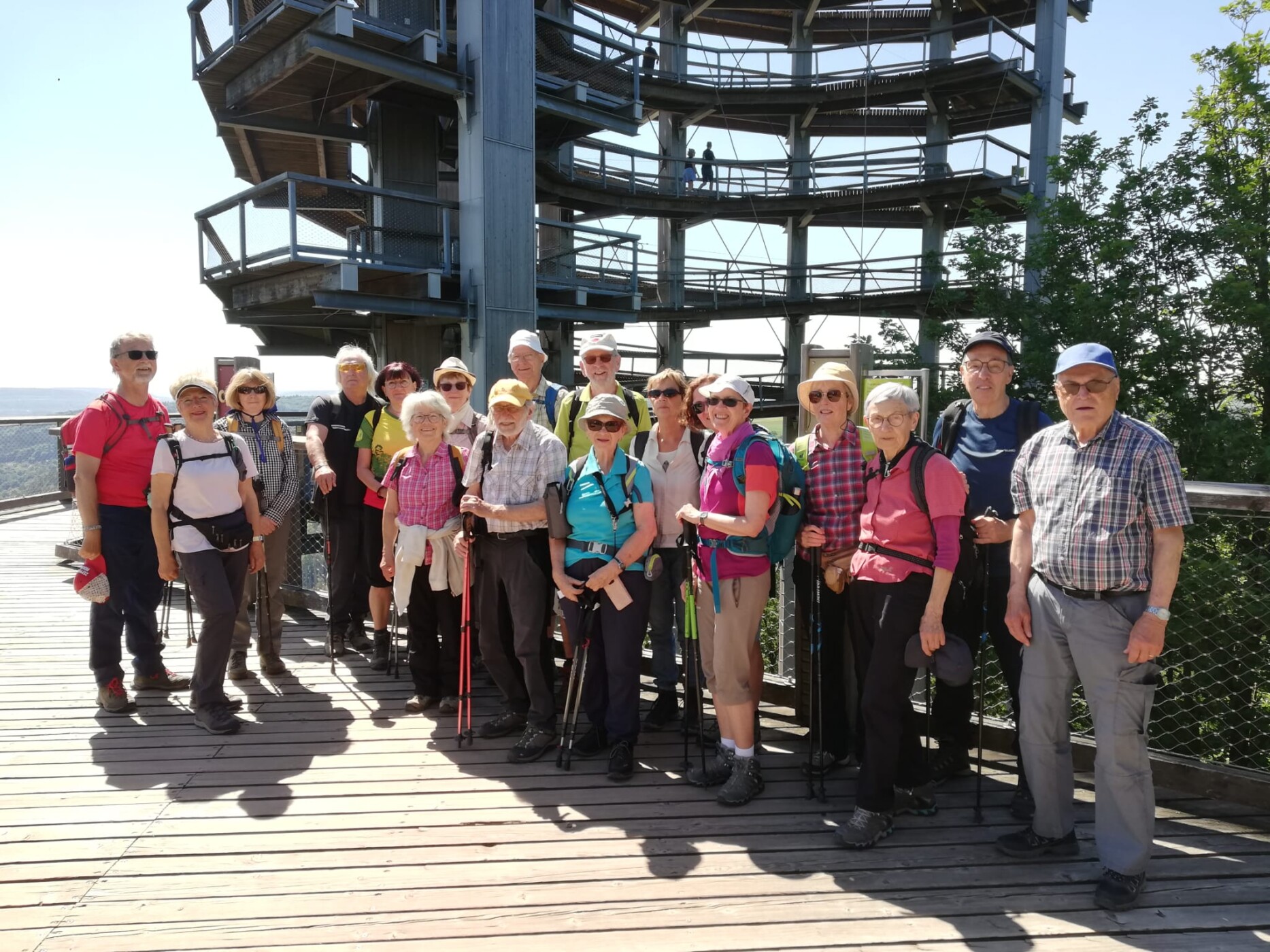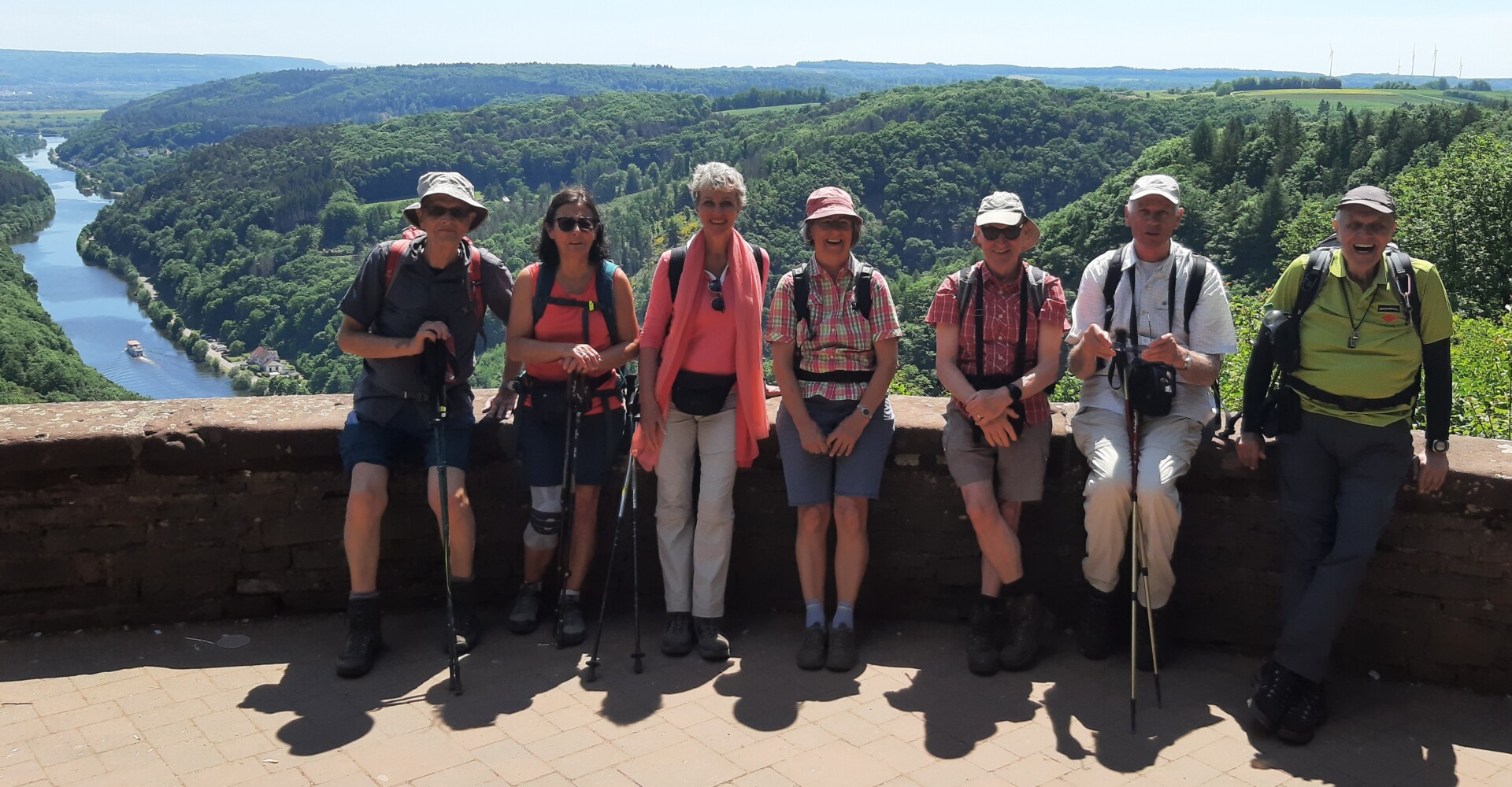 Gute Stimmung, tolles Wetter und eine gute Verpflegung begleitete unser diesjährige Vier-Tages-Wanderung an der Saar, die die beiden Ortsvereine Yburg und Gaggenau organisierten. Insgesamt 33 Personen logierten in Saarburg, der historischen Stadt mit dem Wasserfall. Insgesamt legten die beiden Wandergruppen 65km und knapp 1500Hm in einer sehr schönen und abwechslungsreichen Landschaft entlang der Saar zurück. Höhepunkte waren die bekannte Saarschleife am Cloef über Mettlach und ein Besuch des Weingutes von Günther Jauch bei Kanzem. Von Mettlach führt ein sehr schöner und abwechslungsreicher Wanderweg entlang der Saar z. T. über Felsgrate hinauf zum Aussichtspunkt Cloef. Über einen steilen Bergpfad, der Traumschleife Cloepfad, ging es hinab zur Saar, die wir mittels einer Fähre überquerten, um zur Burgruine Montclair auf zu steigen. Einige der B-Wanderer nutzen die Gelegenheit, um hoch auf den Baumwipfelpfad zu gehen und die dortige tolle Aussicht zu genießen. In Mettlach nutzen wir die dortigen Cafés und Eisdielen zur Überbrückung bis zur Zugabfahrt.